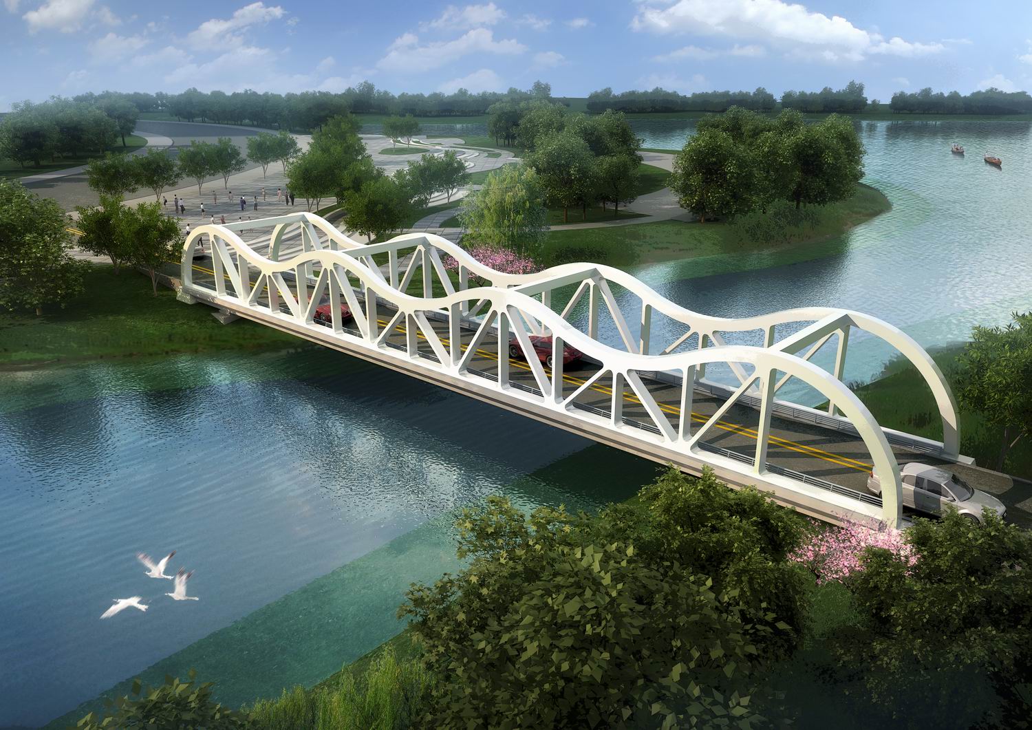 定陶汽車小鎮七座景觀橋工程,位于菏澤市定陶區東北側,工程包括七座橋梁設計:園區一路橋梁一,長60米,寬40米;園區一路橋梁二,長39米,寬40米;園區二路橋梁,長48米,寬40米;園區三路橋梁,長39米,寬40米;園區五路橋梁,長104米,寬8米;園區六支路橋梁,長30米,寬24米;園區人行橋,長150米,寬3米。方案設計突出與汽車小鎮建設主題相融合,工程投資約6600萬元。